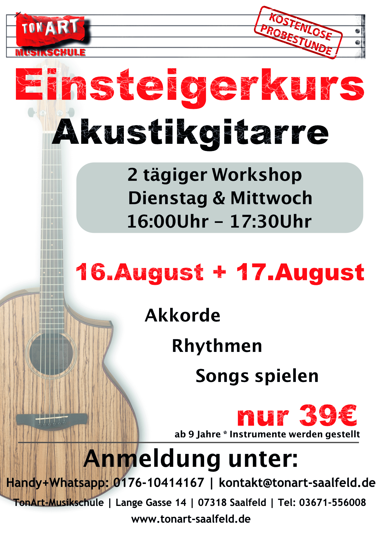 Wir laden dich auch herzlich zu unserem Einsteigerkurs Akustikgitarre am am 16. und 17. August ein.